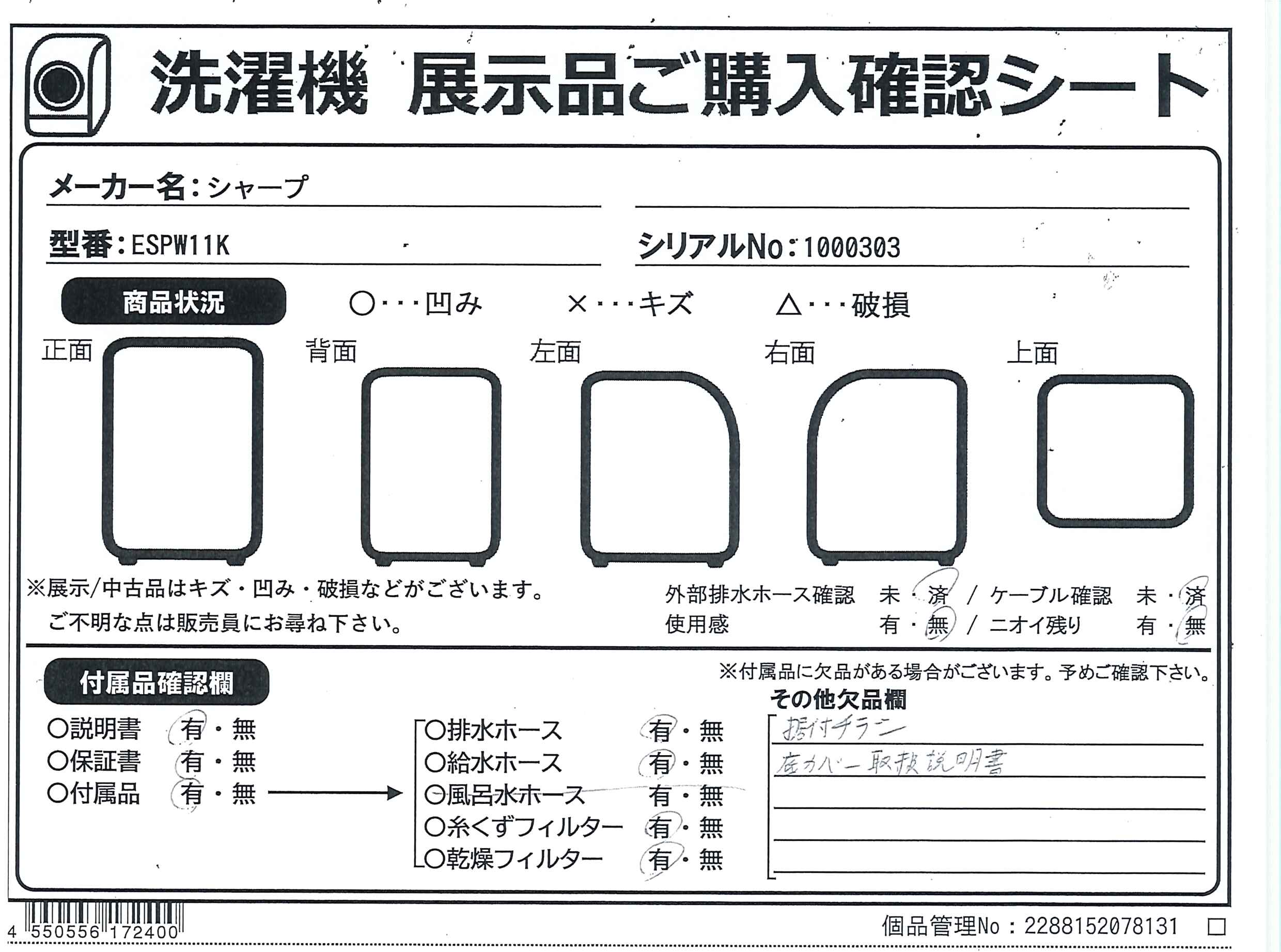 中古商品ランクについて 付属品・商品状態について 〔付属品〕取扱説明書、シャープクラウドサービスガイド、底カバー、底カバー取付ねじ×6、給水ホース、水栓つぎて、ハンガーA、脚スペーサー(6mm)×2、接着テープ×2