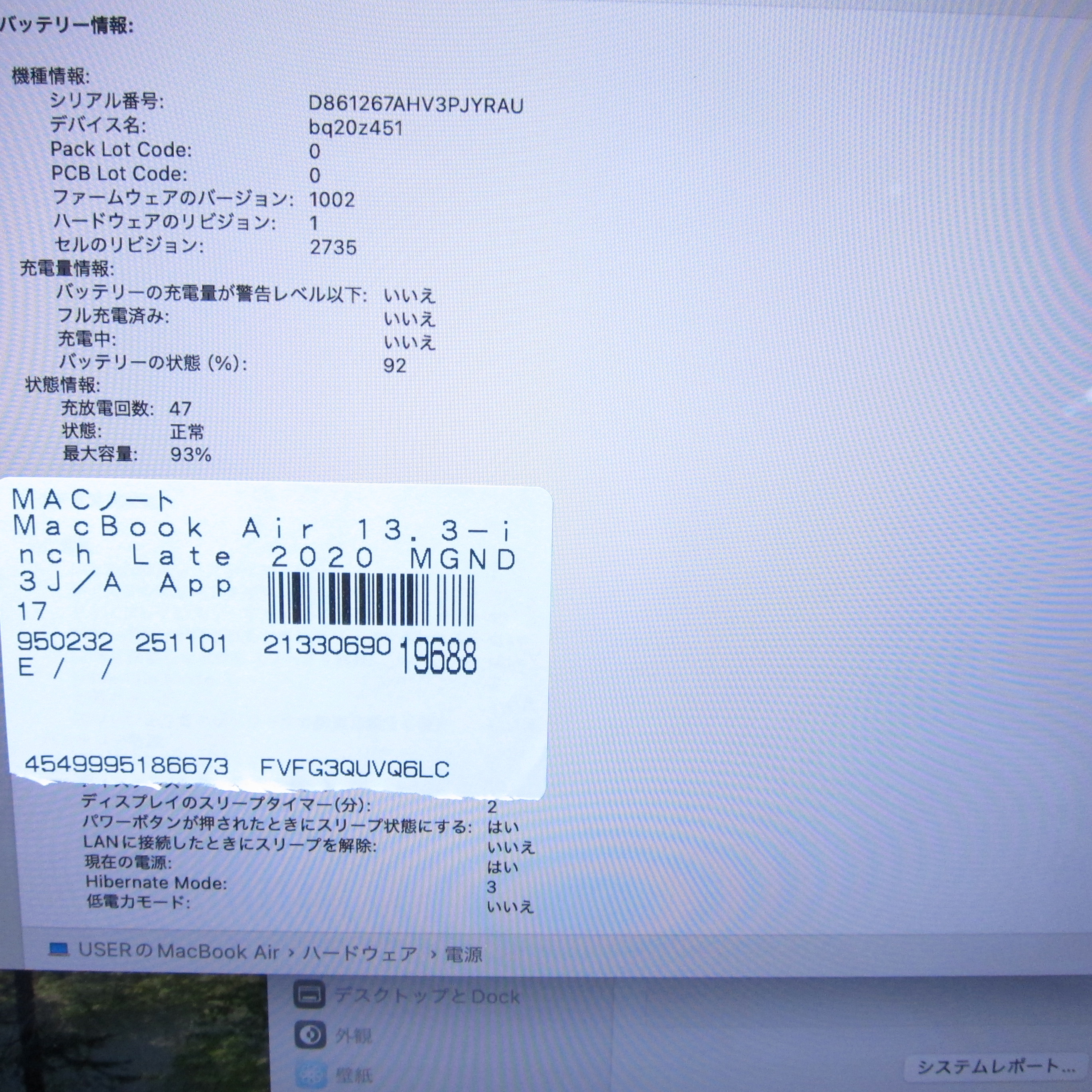 〔中古品〕 MacBook Air 13.3-inch Late-2020 MGND3J/A Apple M1 8コアCPU_7コアGPU 8GB SSD256GB ゴールド 〔15.3 Sequoia〕 [グラフィック:オンボード/JISキーボード]