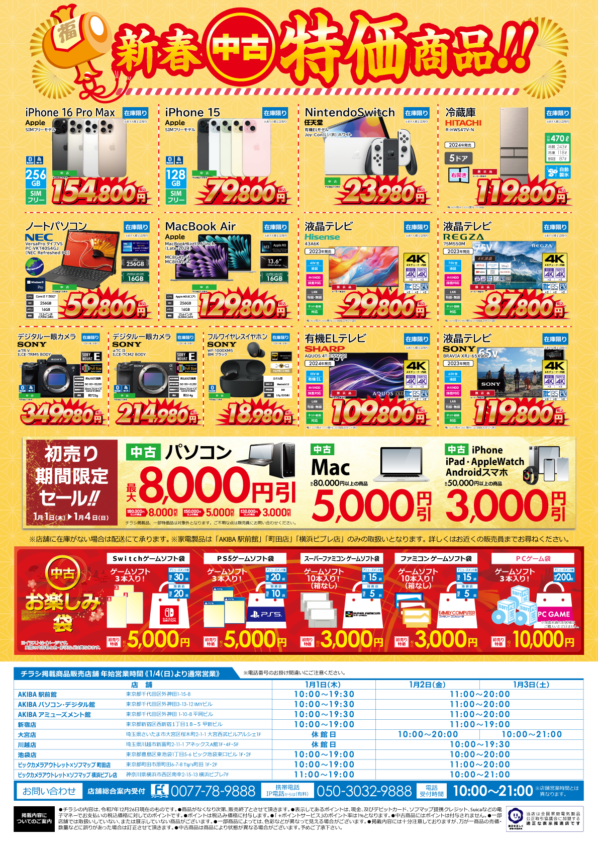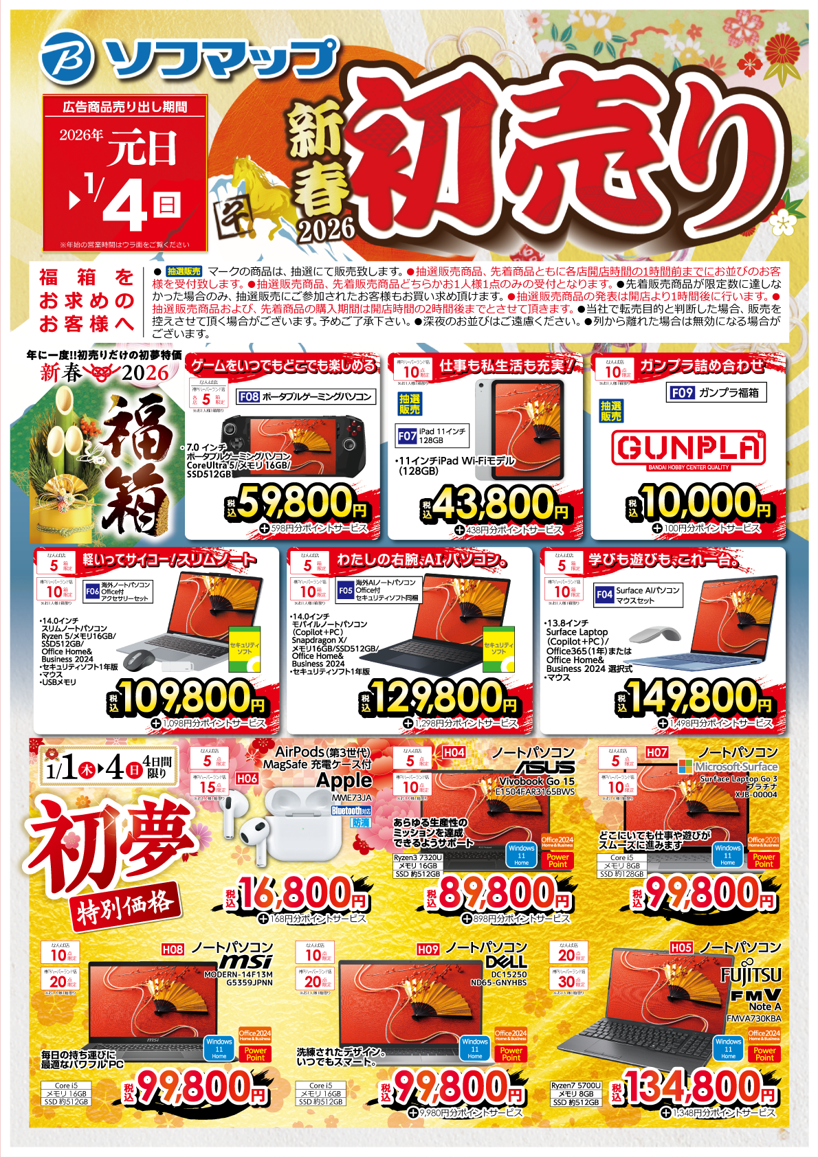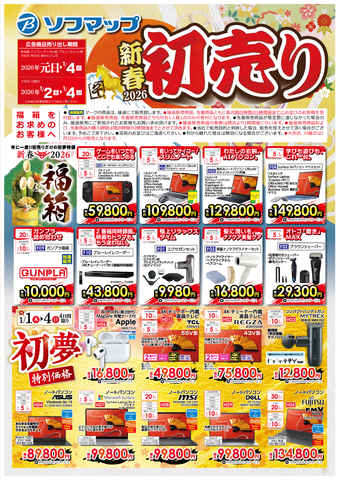 ソフマップの初売り開催中! パソコンから家電までお得なセールを開催中! 売り出し期間:1月1日(木) 〜 1月4日(日) 東日本 西日本 通販を見る 東日本 《セール商品・取り扱い店舗》 仙台駅前店【ゲーム】 AKIBA 駅前館【家電】 AKIBA パソコン・デジタル館【パソコン】 AKIBA アミューズメント館【ゲーム】 川越店【パソコン】 大宮店【パソコン】 町田店【パソコン・家電】 横浜ビブレ店【パソコン・家電】 PDFを見る PDFを見る 西日本 《セール商品・取り扱い店舗》 なんば店【パソコン】 ビックカメラアウトレット×ソフマップ なんば店【家電】 神戸ハーバーランド店【パソコン・家電】 PDFを見る PDFを見る