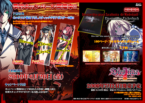 こんにちわ、lightでございます!lightがお贈りする学園伝奇バトルオペラ「Dies irae」新装版「die Wiederkunft」の 予約キャンペーンの締切が6月26日と迫ってまいりました! ![]() 予約キャンペーンの画像も出来上がり、ストーリー本編では見られないちょっとHな スティックポスターを是非この機会に!! ![]() そして、そして! 今日できたてのソフマップさん特典テレカはこちら!!! ![]() 初回版にのみ同梱されるヴィジュアルファンブック(通称:黒本)は なんと160P・フルカラーの超大ボリュームです!! ![]() でき上がってきたサンプルページはこちらです!! ![]() 初回版は受注限定生産となっていますので、予約をお悩みでしたら是非この機会に!! 以前の2007年パッケージをお持ちの方へのサポートも予定しております。 詳しくはlightオフィシャルHPでご覧ください!! 2009/6/18