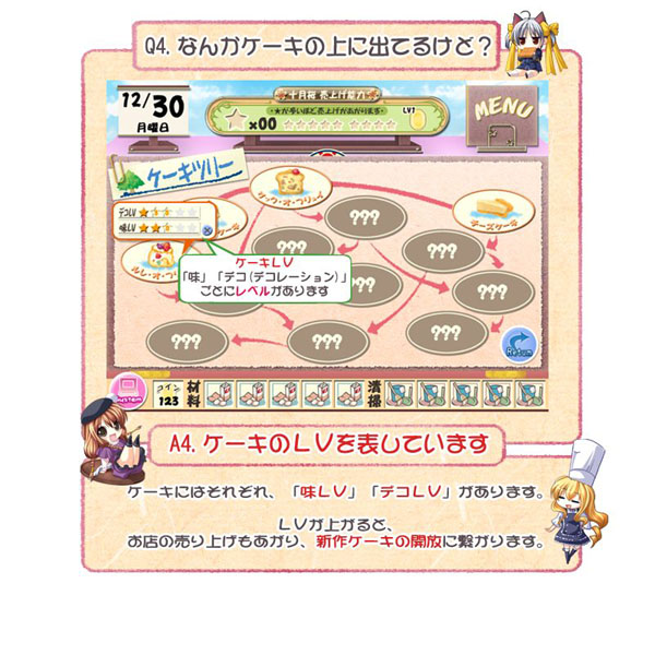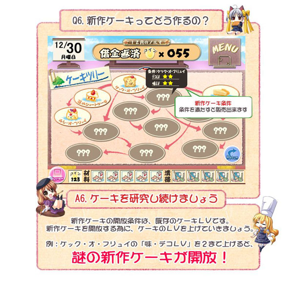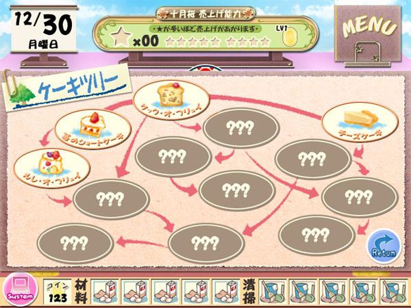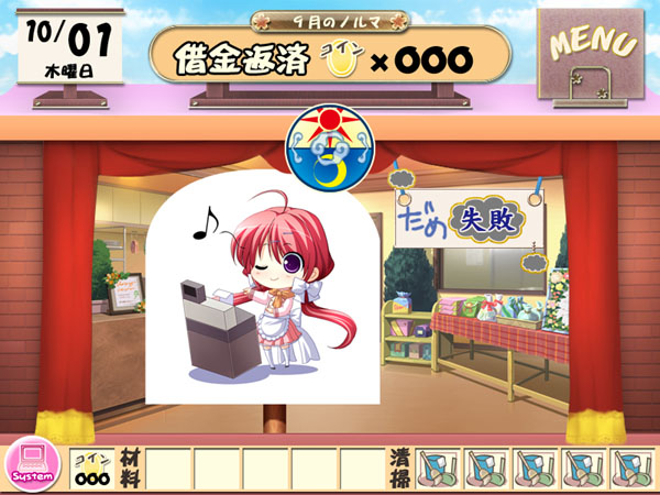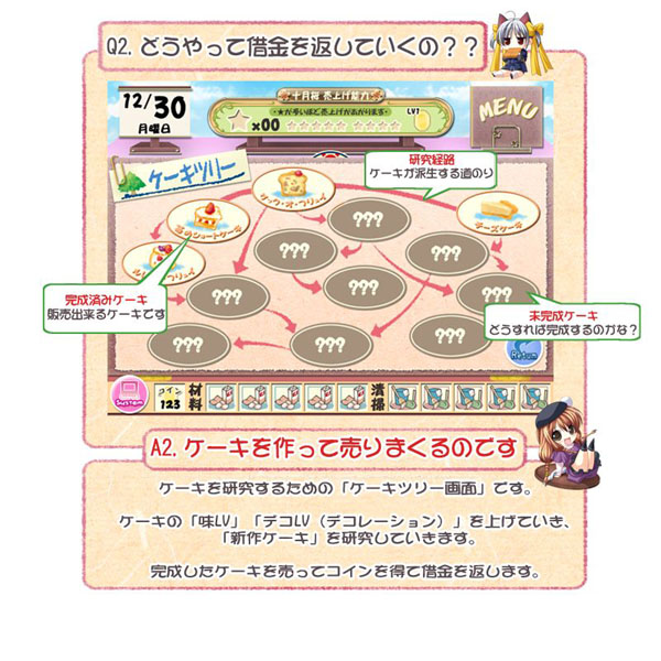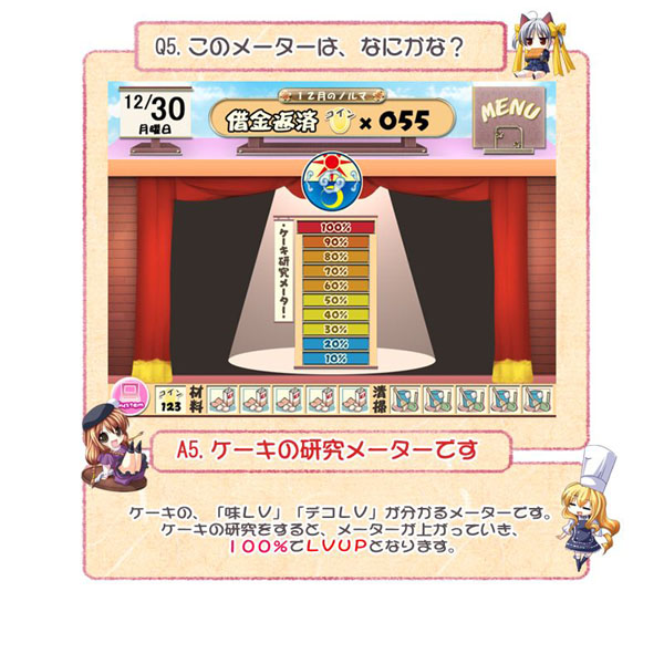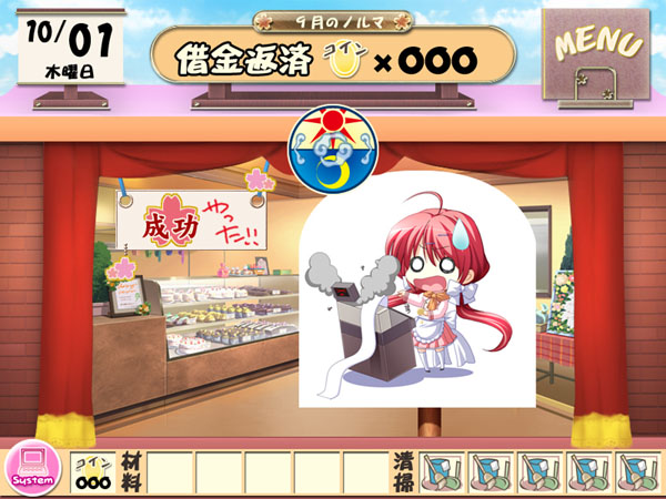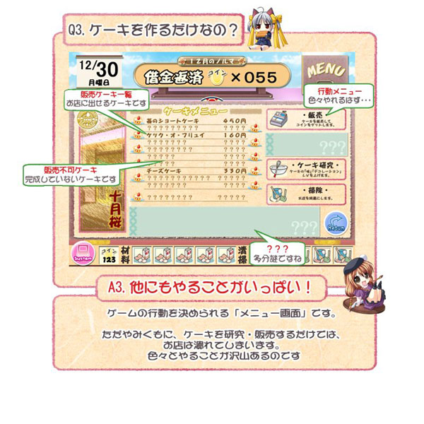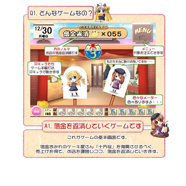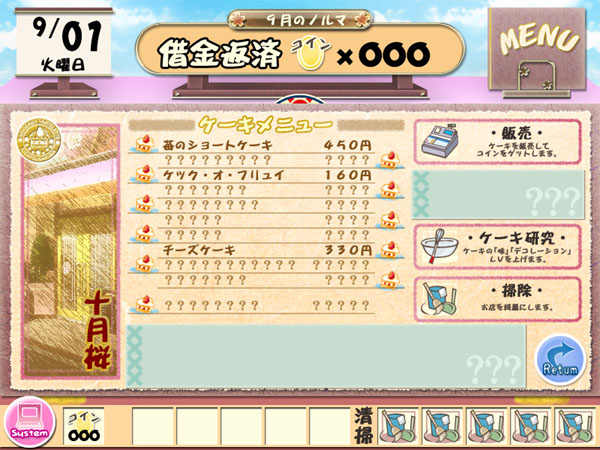 自分がパティシエを目指すきっかけになった 洋菓子店『十月桜(じゅうがつざくら)』を思い出し、 十数年振りに足を運ぶことにする。 小さいが可愛らしい店構えに、甘く優しい香りに包まれた店内。 一口食べれば誰もが笑顔になるケーキの数々。 思い出のケーキ店を思い浮かべながら『十月桜』に到着すると、 そこには外観はボロボロで、休業中との看板が下げられた、 人気の無いお店『十月桜』の姿があった。 愕然としながらも『十月桜』で話を聞くと、 前の店主でもあったパティシエが亡くなってしまい、 今はその娘姉妹が切り盛りしているが、赤字続きで経営は悪化。 『十月桜』は閉店する予定だと言う。 思い出がいっぱい詰まった、 パティシエになるきっかけをくれたお店『十月桜』が消えてしまう。 自分はただ見ているだけしか出来ないのか? 暁人「いいや、そんなことはさせない!」 奮い立つ暁人は洋菓子店を救うため、姉妹に協力を申し出ることに。 『何事にも捕らわれず、桜は二度咲く』 そんな亡くなった店主の想いが込められた姉妹の洋菓子店『十月桜』は、 もう一度、返り咲くことが出来るのだろうか? このような流れがあり、主人公・暁人は『十月桜』で、 姉妹と共に借金の返済をしていくことになります。 毎月末になると借金の返済をしなくてはいけない『十月桜』は、 お店でケーキを売ったコイン(売上)で借金を返済していきます。 この借金が返せないとBAD ENDが待っていますので要注意です。 では、どうすればコイン(売上)をゲット出来るのか? 簡単です!お店の売上を上げるにはケーキのレベルを上げたり、 新作ケーキの研究をしていけば良いのです。 また、お店を汚してると集客が減り、結果的に売上が減り、 コインが得られなくなってしまうのでマメに掃除しましょう!